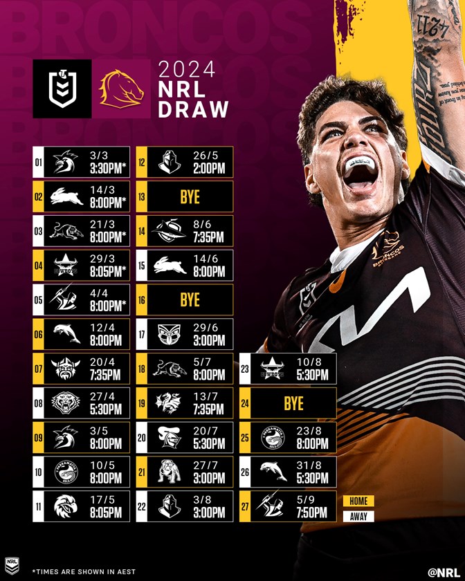 The Broncos see last year's three bottom placed sides – Wests Tigers, Dragons and Bulldogs just once – along with the Knights (A), Warriors (A), Sharks (H), Raiders (H) and Sea Eagles, the latter of which is an away game at Suncorp in Magic Round.