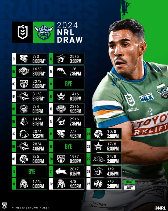 The Raiders have the bonus of avoiding playing either of last year's grand finalists twice, while they'll also come up against the Eels, Titans, Dolphins, Storm, Rabbitohs and Dragons just once in 2024.