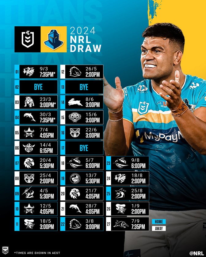 Home and away fixtures await the Titans with all three of their Queensland rivals, the Dolphins, Cowboys and Broncos, while they'll also take on the Warriors, Knights, Sharks, Dragons and Sea Eagles on two occasions.