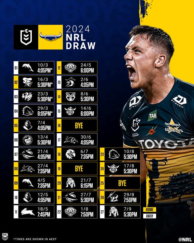 Home and away fixtures await against Queensland rivals the Dolphins, Titans and Broncos. They have to face the defending premiers twice, but the Cowboys also play last year's wooden spooners Wests Tigers and 15th-placed Bulldogs both home and away, with the Sharks and Raiders the other teams they'll see more than once during the regular season.