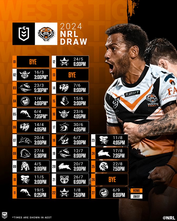 With a bye while players are out for Origin I in Round 13, Wests Tigers play against the Dragons 48 hours after the series opener. In Round 16 and 19 – when Origin players will be out – they play the Raiders and Sharks, with the Roosters and Rabbitohs the sides they will back up against in Round 17 and 20 respectively.
