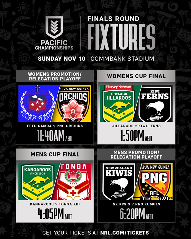 The National Rugby League (NRL) has today confirmed the fixture for the 2024 Pacific Championships Final, with four back-to-back matches to be played at CommBank Stadium in Sydney next Sunday (November 10).