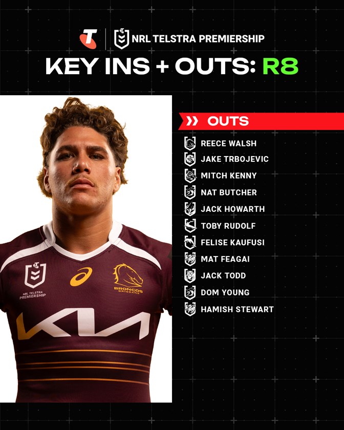 - Selwyn Cobbo will replace the injured Reece Walsh as Brisbane fullback, with Deine Mariner named on the wing.