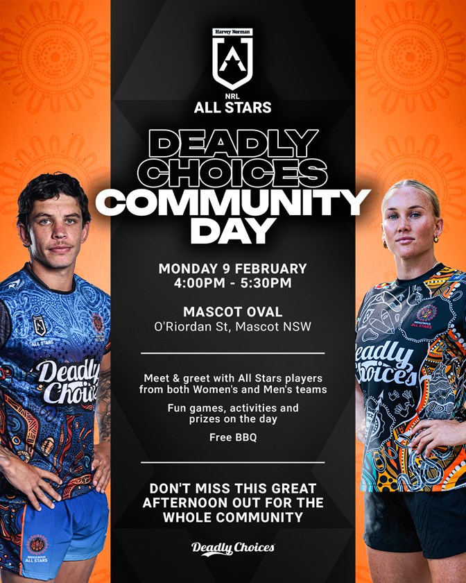 Deadly Choices are bringing the NRL Indigenous All Stars to Mascot Oval. Meet and greet with players from the men's and women's teams, participate in fun games and activations and have your chance to win prizes. There will also be a free BBQ for the community.